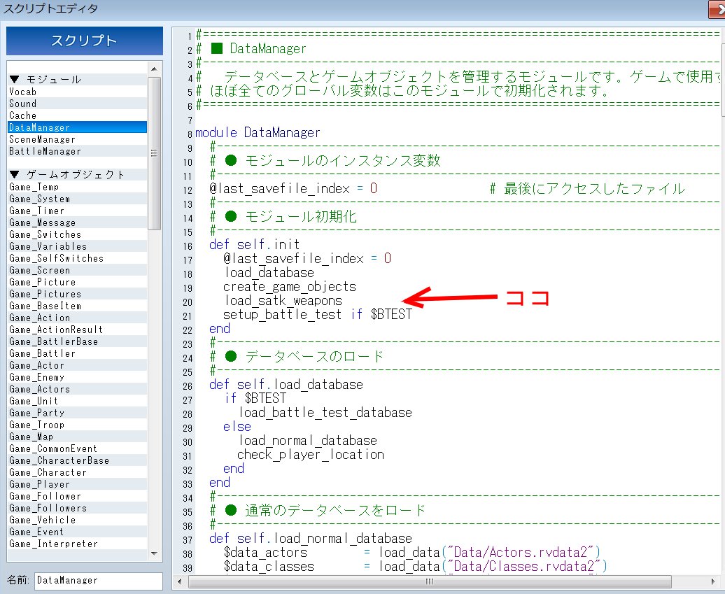 上のスクリプトたちを導入した後、本体のDataManager内のself.initのcreate_game_objectsの下にload_satk_weaponsを挿入してください。