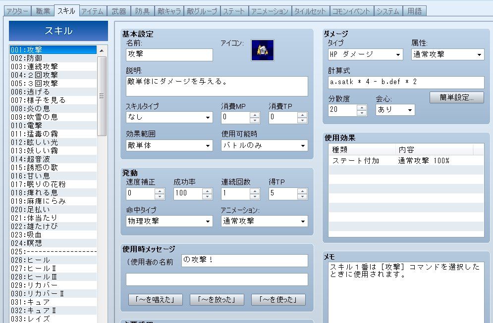 Game_Actorにsatkという武器によって参照するパラメータを変えるメソッドが追加されます。これをスキルにおけるダメージ計算式に用いることで武器によって参照先が異なるスキルを作ることができます。
