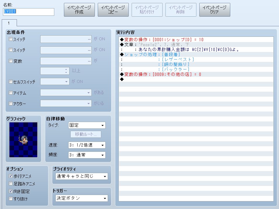 ちなみに上でショップ後に変数9に指定しているのは、こちらのミスでほかの店を使用した際に前の店の累計に加算してしまうのを