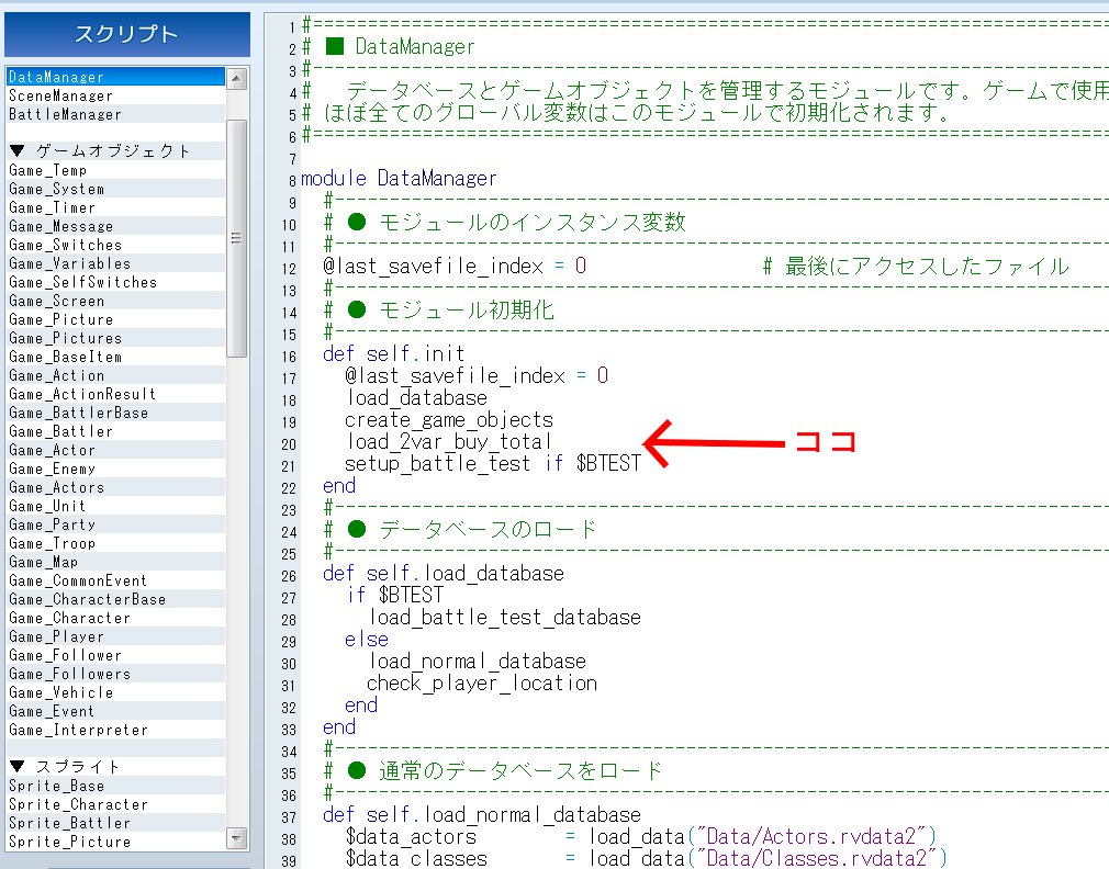 上のスクリプトたちを導入した後、本体のDataManager内のself.initのcreate_game_objectsの下にload_2var_buy_totalを挿入してください。