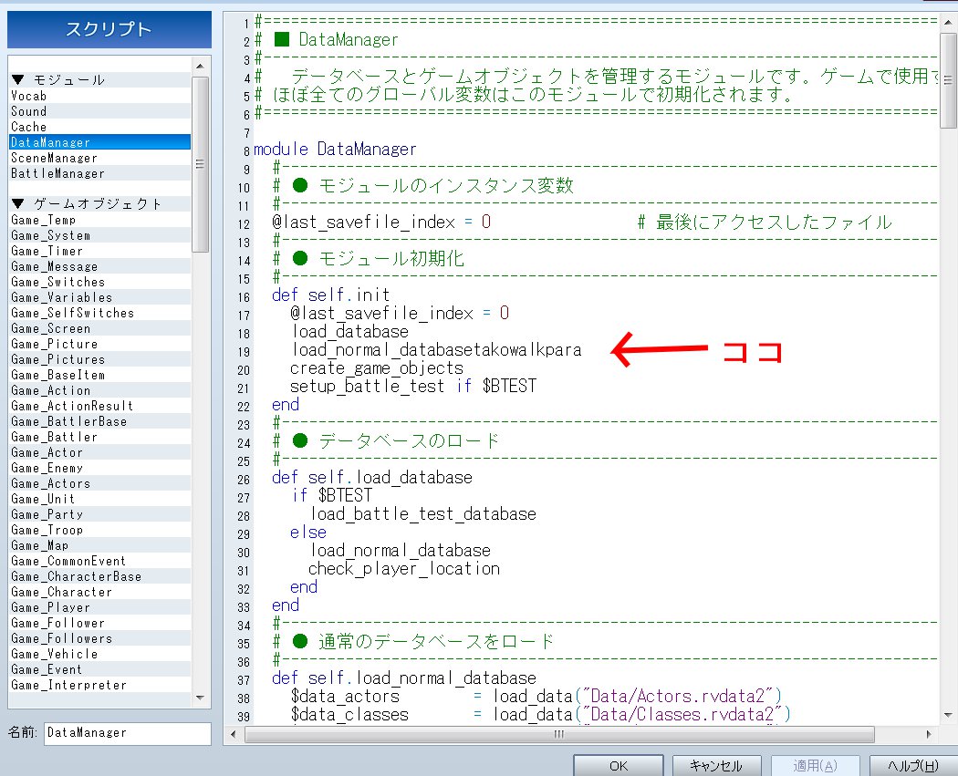 上のスクリプトたちを導入した後、本体のDataManager内のself.initのcreate_game_objectsの下にload_normal_databasetakowalkparaを挿入してください。